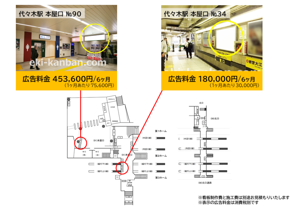 代々木駅の西口改札・東口改札付近にある広告看板です。こちら以外の広告についてはスタッフまでお問い合わせください。
