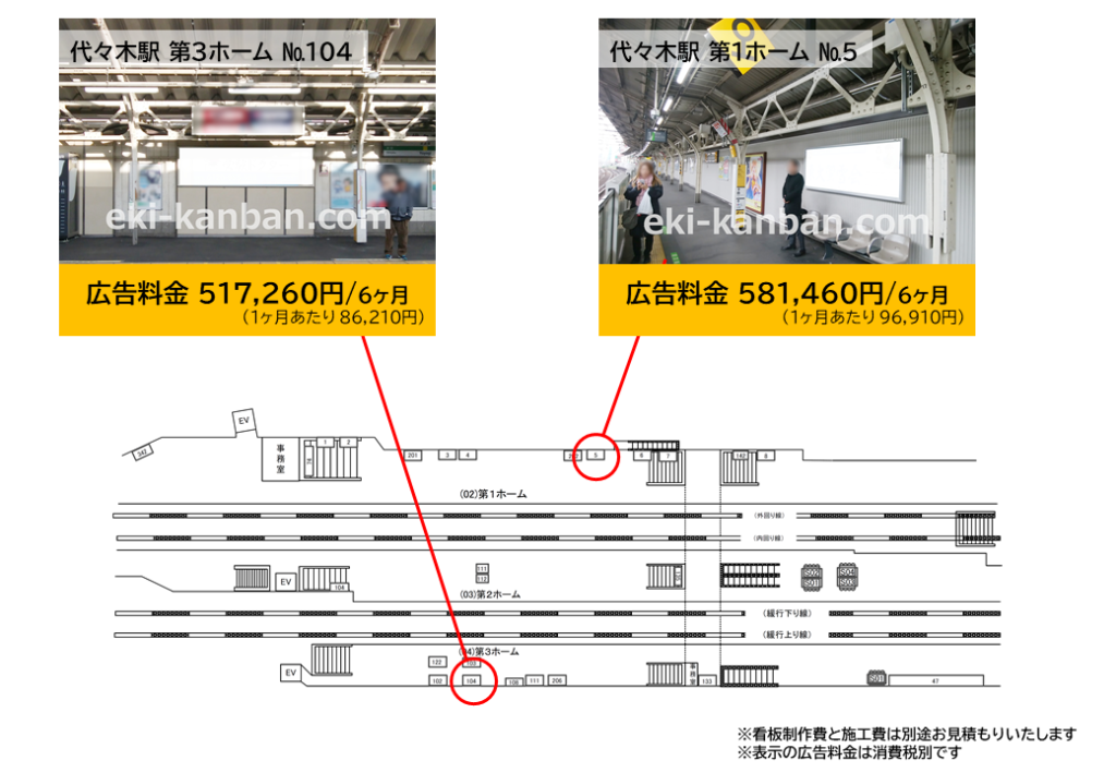 代々木駅の山手線・中央線総武線各駅停車ホームにある広告看板です。これら以外の広告についてはスタッフまでお問い合わせください。