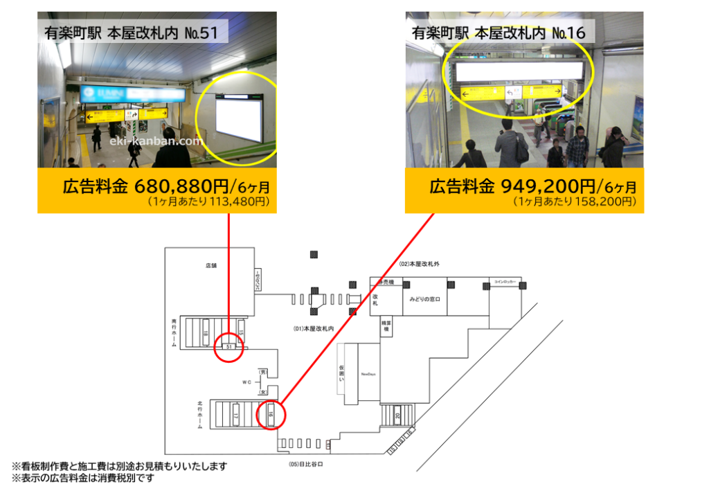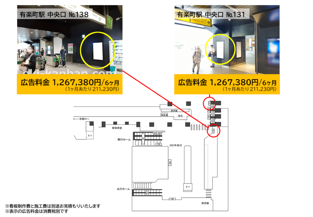 有楽町駅の銀座口と日比谷口付近にある広告看板情報です。