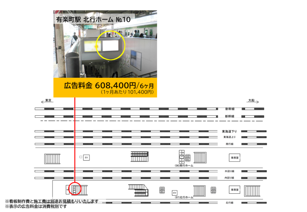 有楽町駅の山手線ホーム・京浜東北線ホームで使える駅広告です。有楽町駅のホーム階は広告看板設備に限りがあります。 短期プロモーションであればホームドアシートなどの駅看板以外の広告をご案内いたします。