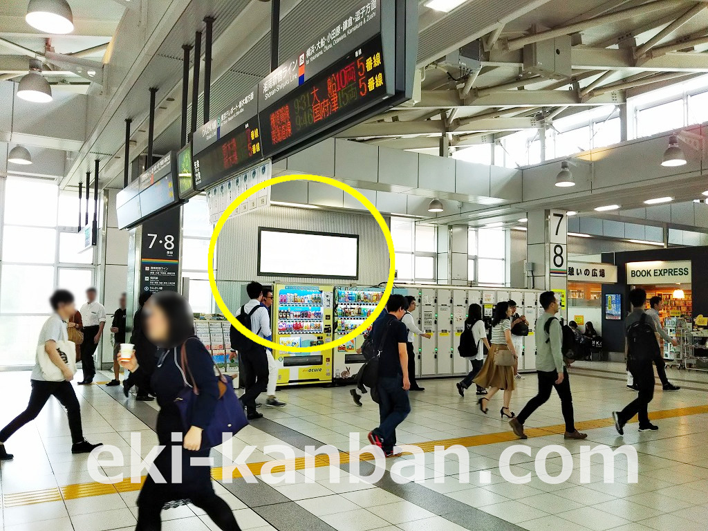 改札階の7・8番線(湘南新宿ライン・埼京線・りんかい線)側の階段横に設置された広告看板です。主に7・8番線を利用される方、駅構内を行き来される際にご覧頂けます。