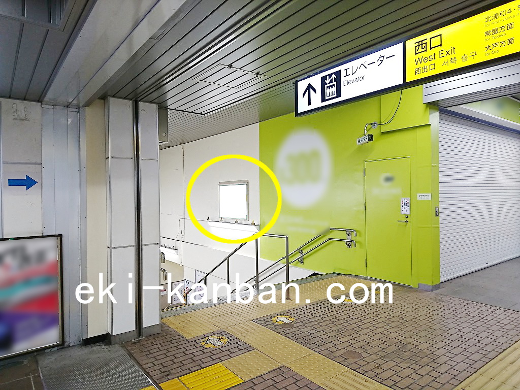 改札外コンコース、西口出口階段そばに設置された広告看板です。
