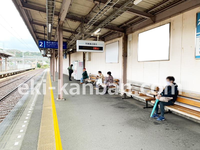 京急線上りホームの壁面に取り付けられた平看板です。(照明設備なし)