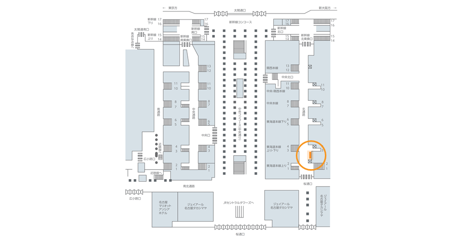 JR名古屋駅の桜通口改札のそばにある大型シート広告です。最大でワイド8.9mの広告を駅構内に掲載します。 ※B0ポスターなら上下2段×横5連貼りの計10枚掲載も可。この場合はワイド7.28mとなります。