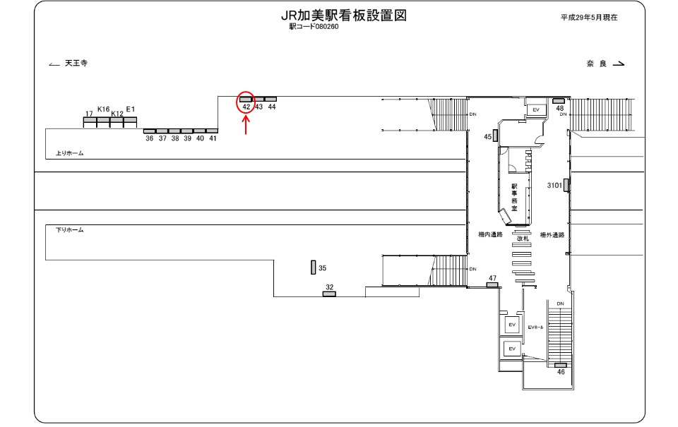 1番線ホーム(王寺、奈良方面)に設置されていますが、反対車線である2番ホーム(天王寺、大阪方面)ご利用の方々にも見ることができる媒体になります。