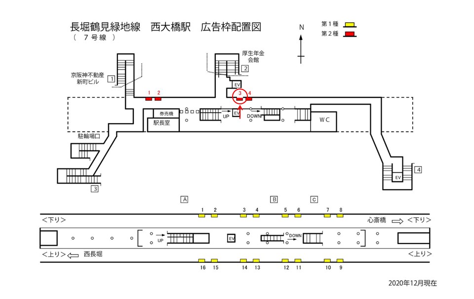 Osaka Metro長堀鶴見緑地線西大橋駅の改札外コンコースに掲出された駅看板です。