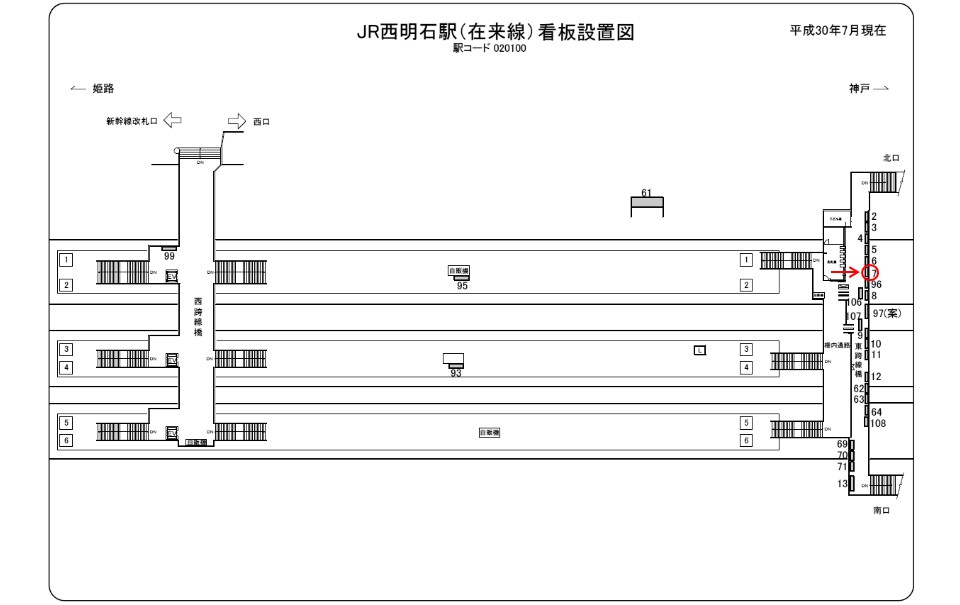 西明石駅の東口改札外通路に設置された電照タイプの看板になります。