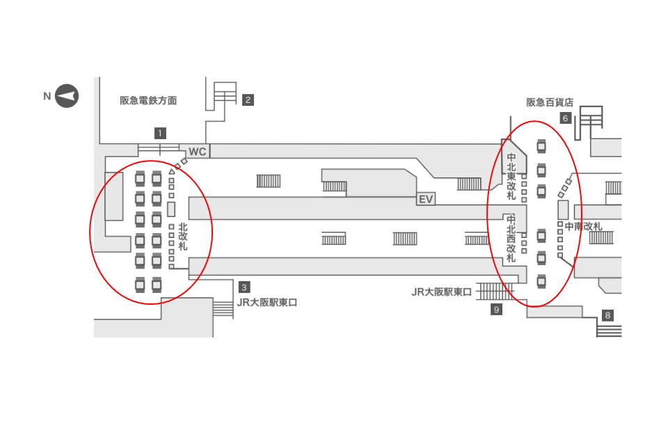 ・大阪環状線、JR京都線・JR神戸線(東海道本線)、JR宝塚線(福知山線) - 大阪駅、JR東西線 - 北新地駅