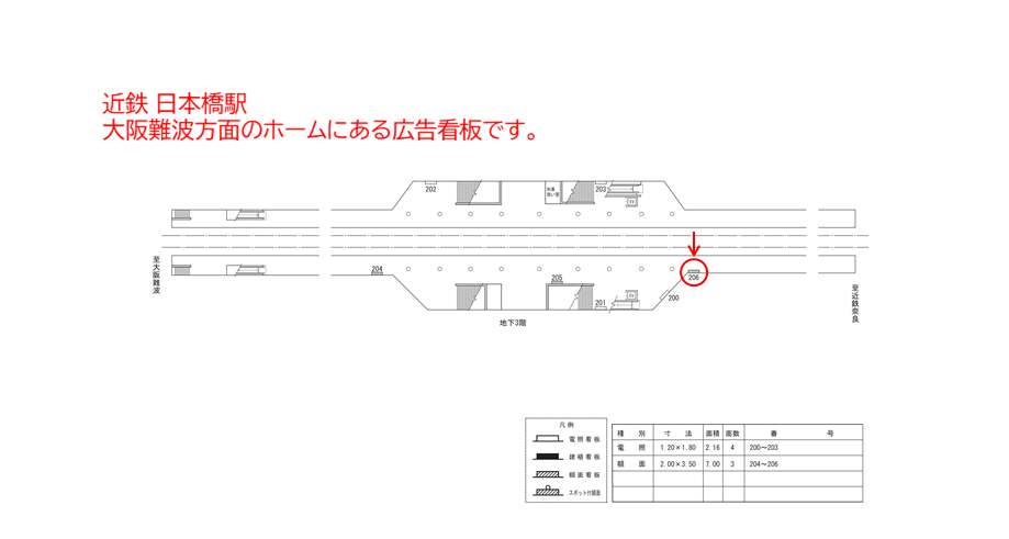 駅看板「近鉄 近鉄日本橋駅 №206」は近鉄 近鉄日本橋駅の難波線・奈良線 大阪難波・神戸三宮方面のホーム上にある看板です。