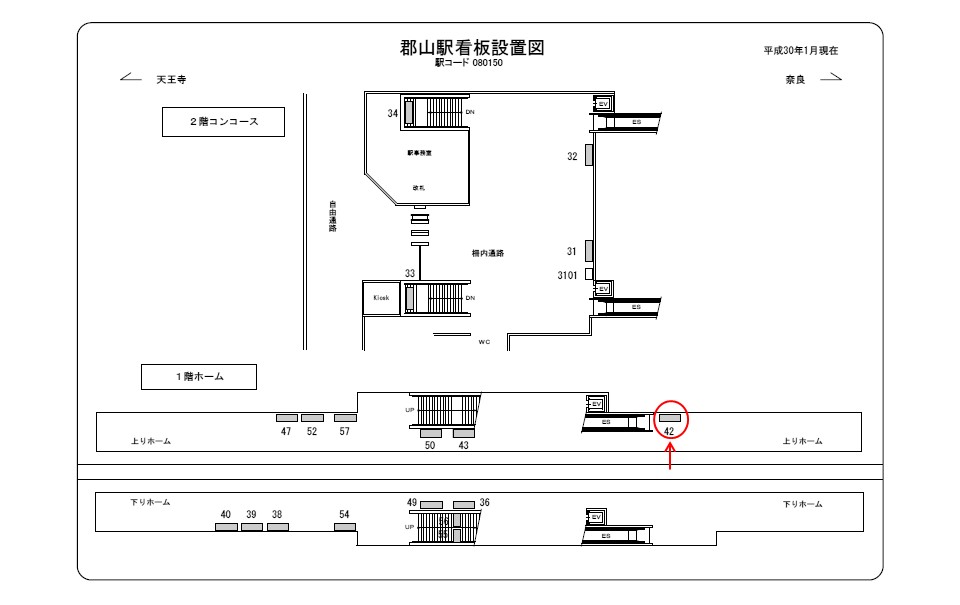 郡山駅1番ホーム(奈良・加茂方面)壁面に掲出される非電照タイプの看板となります。