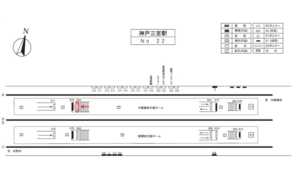 主に大阪梅田方面ホームを降車し、改札に向かわれる方々に向けて訴求します。