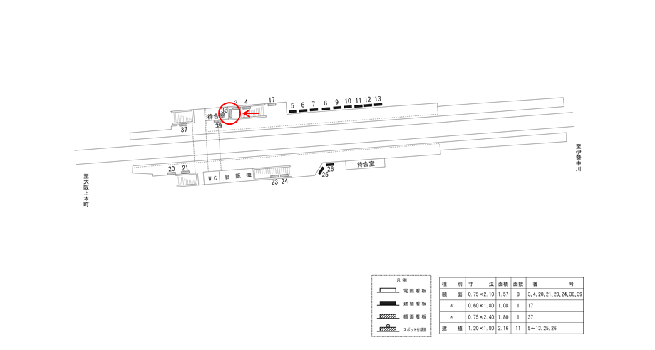 主に伊勢中川方面ホームを降車し改札に向かわれる方々に視認されます。