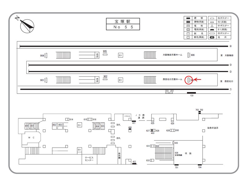 宝塚駅の西宮北口方面行きホームの路線図横に設置された広告看板です。