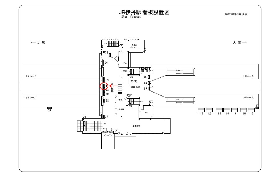 伊丹駅の改札外コンコースに設置された非電照タイプの看板になります。