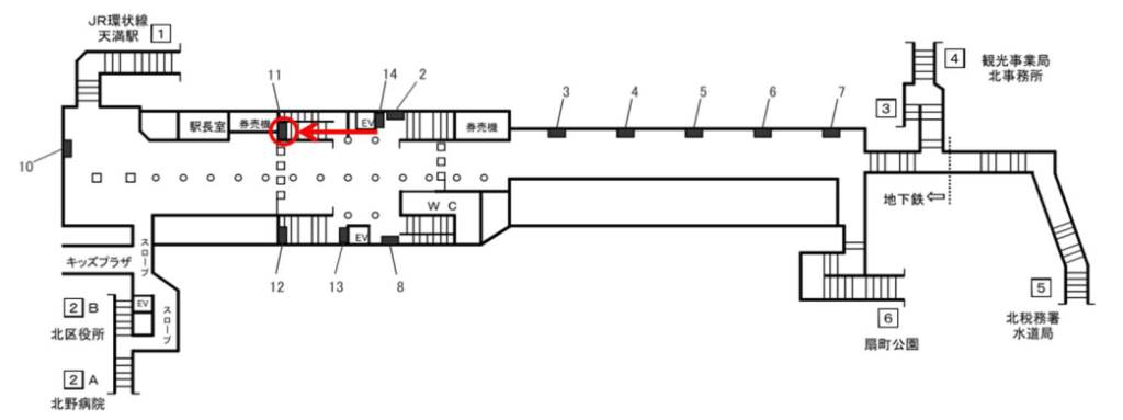 北改札口を出て1番出口から徒歩5分のところにあるJR天満駅と乗り換えが可能である。
