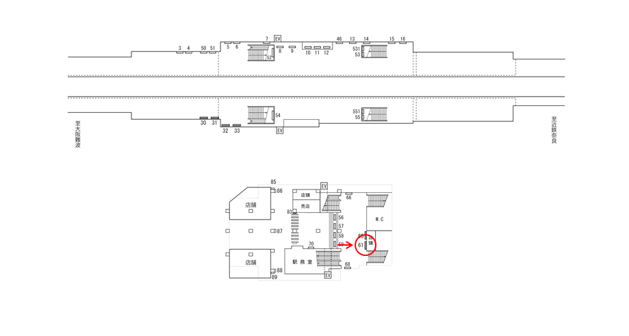 駅構内にある駅看板は「これから電車に乗る方」もしくは「駅を出る方」に見てもらえます。いずれにしても駅を利用するタイミングで広告に接触します。移動中に見てもらえる駅構内の駅看板は、河内小阪駅の周辺にある店舗施設の紹介や道案内に利用されています。特に駅の出口付近にある駅看板は、店舗までの距離が近く案内看板に適しています。