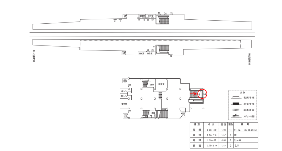 駅構内、出口階段正面にある駅看板はこれから「駅を出る方」に見てもらえます。駅を利用するタイミングで広告に接触します。移動中に見てもらえる駅構内の駅看板は、河内永和駅の周辺にある店舗施設の紹介や道案内に利用されています。特に駅の出口付近にある駅看板は、店舗までの距離が近く案内看板に適しています。