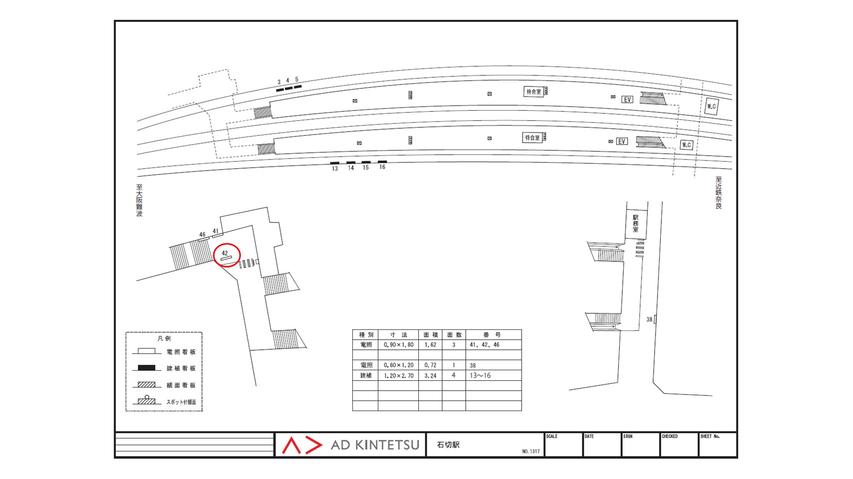駅看板「近鉄 石切駅 №42」は近鉄 石切駅の改札外コンコースにある駅看板です。駅構内の改札前の上側にある駅看板は、これから電車に乗る方々の目に停まり、駅を利用するタイミングで広告に接触します。店舗までの距離が近い案内看板に適しています。