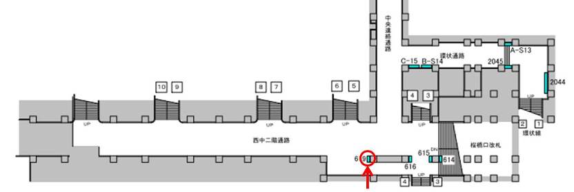 四つ橋線、阪神電車への乗り換え、西梅田・堂島エリア各オフィスビルの地下入り口への導線となる桜橋エリアに設置されたビジョン広告になります。平日朝8時台の人の流動数は中央コンコースを上回ります。