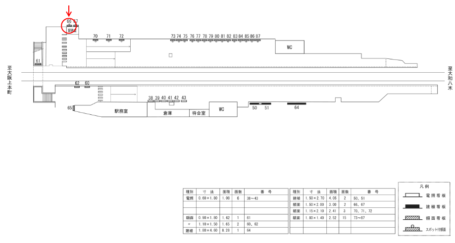 この駅看板は「長瀬駅を利用する方」「長瀬駅周辺を行き来する方」に見てもらえます。移動中に見てもらえる駅構内の駅看板は、長瀬駅の周辺にある店舗施設の紹介や道案内に利用されています。特に駅の出口付近にある駅看板は、店舗までの距離が近く案内看板に適しています。