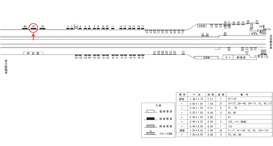 駅看板「近鉄 新大宮駅 №95」は近鉄 新大宮駅の近鉄奈良線 近鉄奈良方面のホーム上にある看板です。