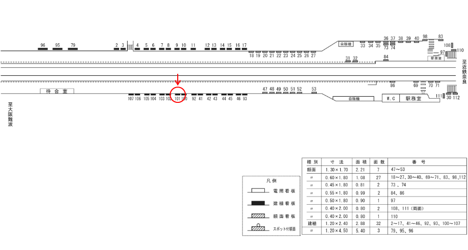 駅看板「近鉄 新大宮駅 №101」は近鉄 新大宮駅の近鉄奈良線 大阪難波・神戸三宮・京都・国際会館方面のホーム上にある看板です。