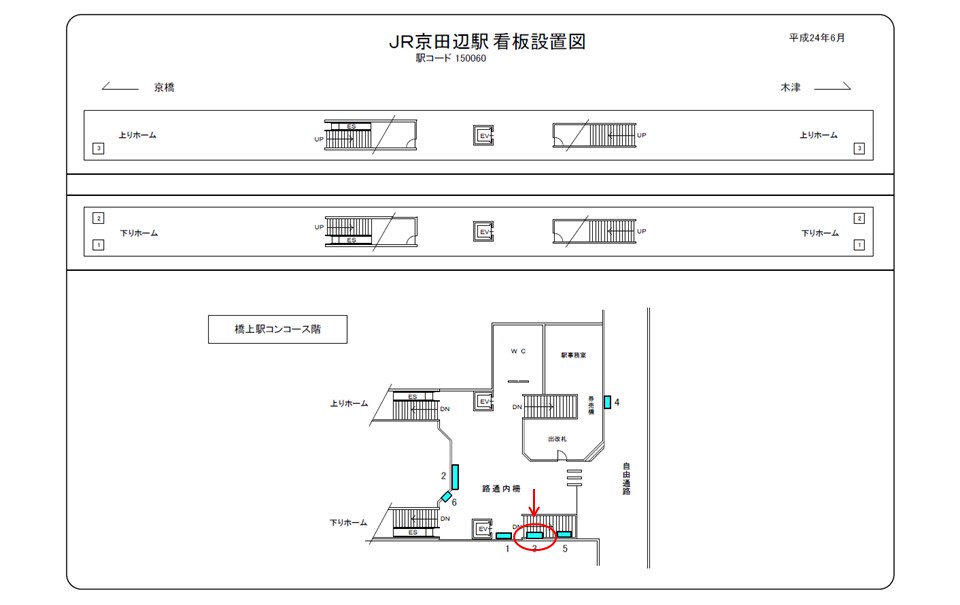 JR京田辺駅の下りホームの階段付近に設置された駅看板のご紹介です。