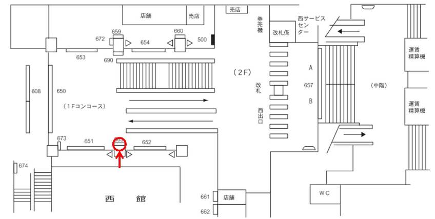 西改札口からエスカレータで1階に下りたところ、西出口付近の柱に設置された電照タイプの広告看板です。