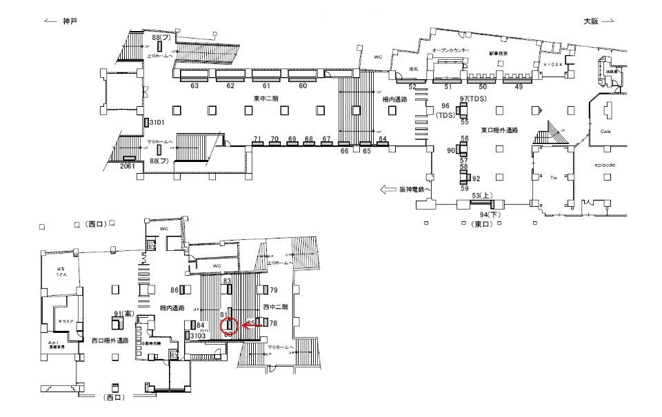 JR神戸線 元町駅の柵内西中二階通路階段柱に設置された電飾タイプの広告看板です。