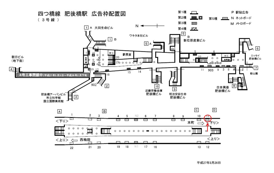 地下鉄肥後橋駅、ホームの駅広告(駅看板)設備のご紹介です。