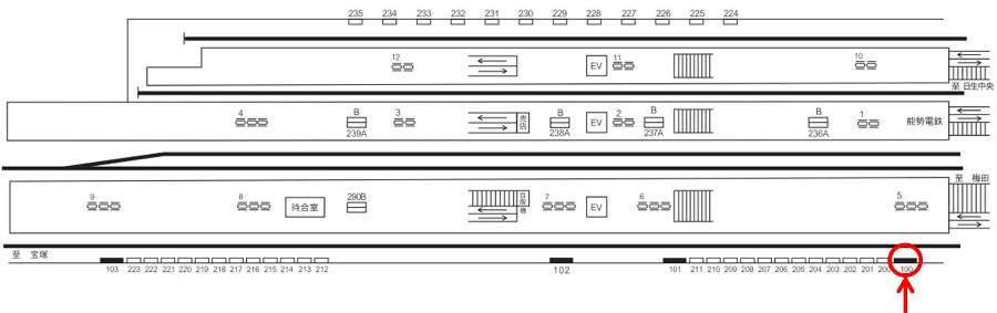 (1番ホーム宝塚方面 2番3番ホーム大阪梅田方面 4番5番ホーム妙見口・日生中央方面)