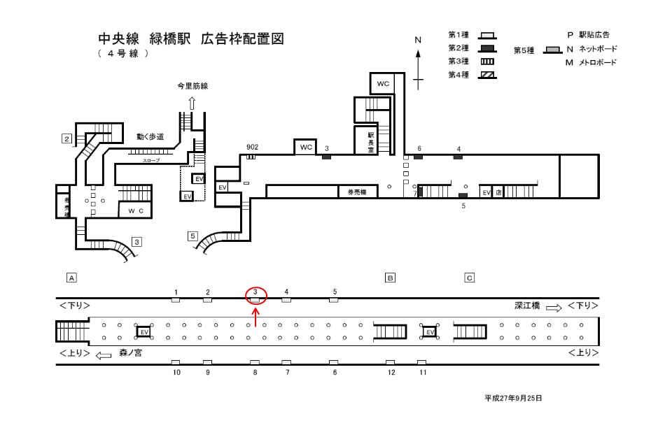 中央線 緑橋駅のホームに設置された電飾タイプの広告看板です。