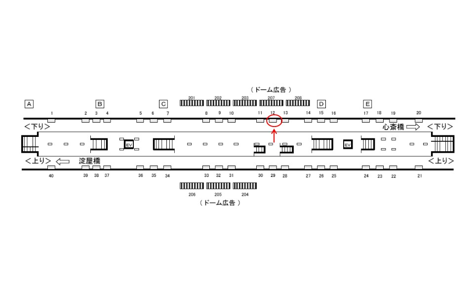 下りホーム(心斎橋方面)にて電車をお待ちの方々に向けて訴求することができます。