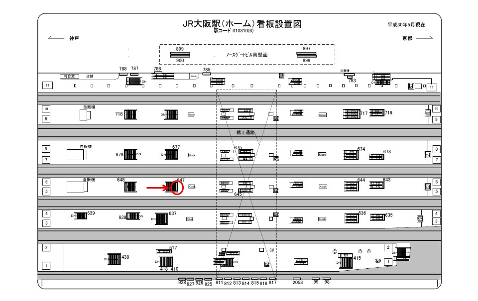主に5・6番ホーム(三ノ宮・宝塚方面)を降車し、改札に向かわれる方々に向けて訴求します。