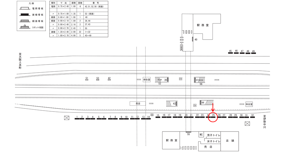 駅看板「近鉄 名張駅 №25」は近鉄 名張駅の線路前にある駅看板です。主に電車を待っている駅利用者に見てもらえます。