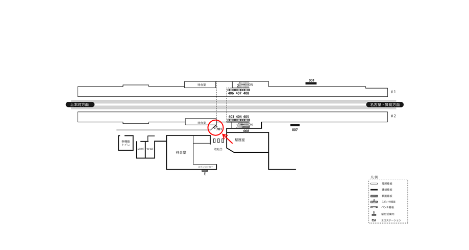 駅構内にある駅看板は「これから電車に乗る方」もしくは「駅を出る方」に見てもらえます。いずれにしても駅を利用するタイミングで広告に接触します。移動中に見てもらえる駅構内の駅看板は、榊原温泉口駅の周辺にある店舗施設の紹介や道案内に利用されています。特に駅の出口付近にある駅看板は、店舗までの距離が近く案内看板に適しています。