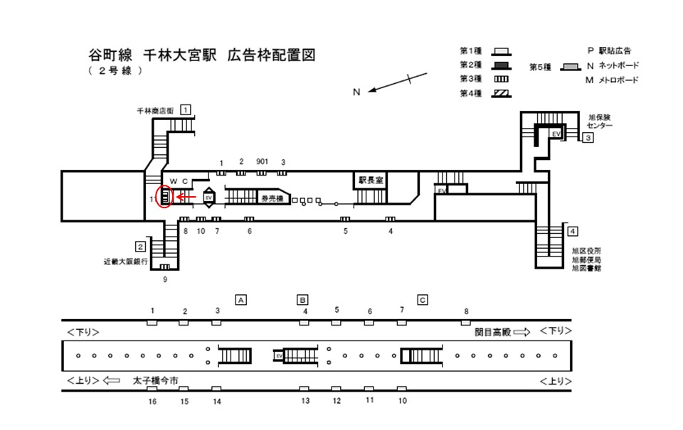 Osaka Metro谷町線千林大宮駅の階段見附に掲出された駅看板のご紹介です。