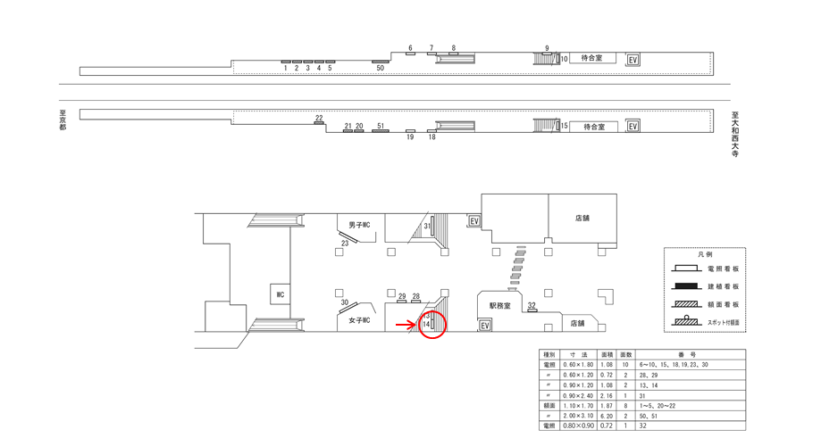 駅看板「近鉄 桃山御陵前駅 №14」は近鉄 桃山御陵前駅の改札内コンコースのホーム階段正面にある電飾看板です。