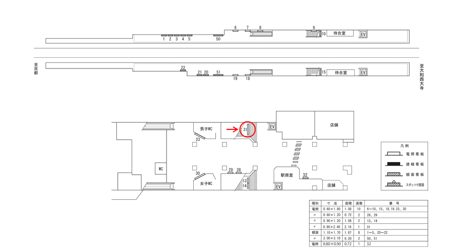 こちらの駅看板は「駅を出る方」に見てもらえます。階段付近は駅利用者が集中するエリアで目に留めてもらいやすい広告ロケーションです。サービス周知や企業広告などに適しており、日常的に駅を使う「桃山御陵前駅に生活基盤をもつ消費者」を対象とした広告にオススメです。
