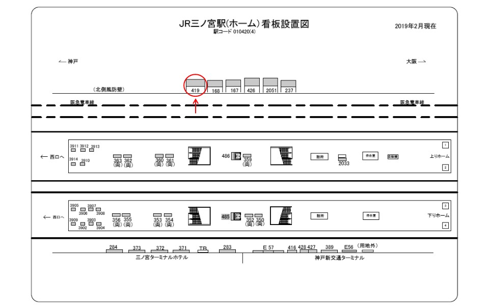 ホーム線外に掲出される看板は電車をお待ちの方々に対して比較的長い時間視認してもらえる媒体となります。三ノ宮駅を利用される方々への長期的なご案内をお考えのお客様にお勧めいたします。