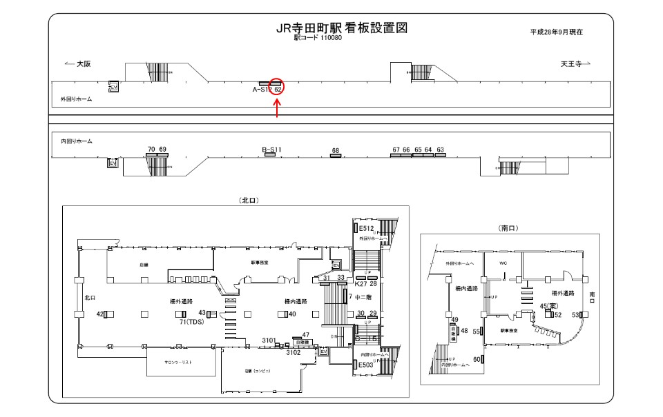 JR寺田町駅の外回りホームに設置された駅看板です。