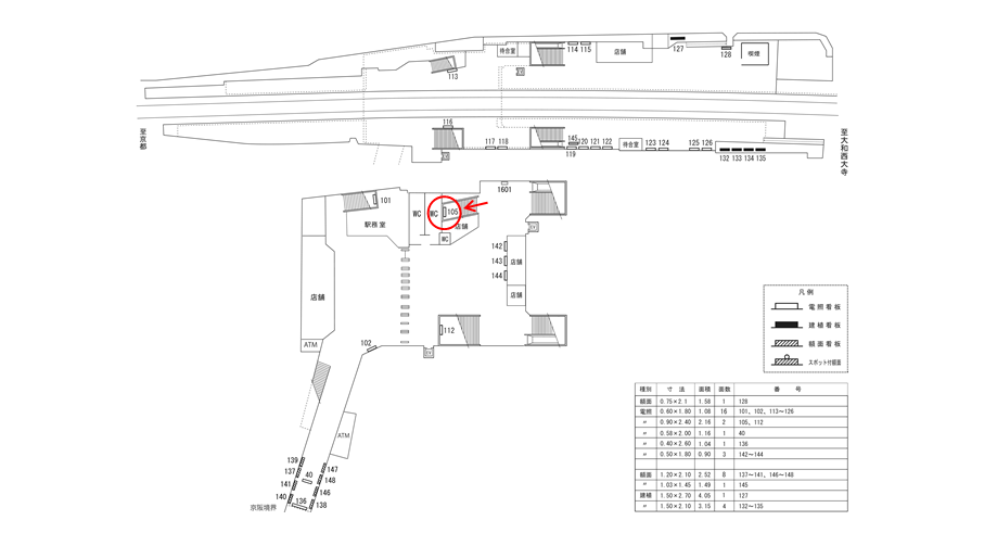こちらの駅看板は「これから電車に乗る方」に見てもらえます。階段付近は駅利用者が集中するエリアで目に留めてもらいやすい広告ロケーションです。サービス周知や企業広告などに適しており、日常的に駅を使う「近鉄丹波橋駅に生活基盤をもつ消費者」を対象とした広告にオススメです。