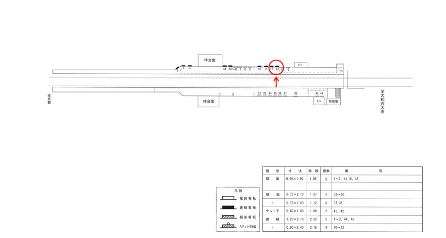 駅看板「近鉄 久津川駅 №13」は近鉄 久津川駅の近鉄京都線 新田辺・大和西大寺・天理・橿原神宮前方面のホーム上にある看板です。ベンチ付近にある看板のため、接触時間の長さを活かして電車待ちの方々に広告内容をアピールすることができます。