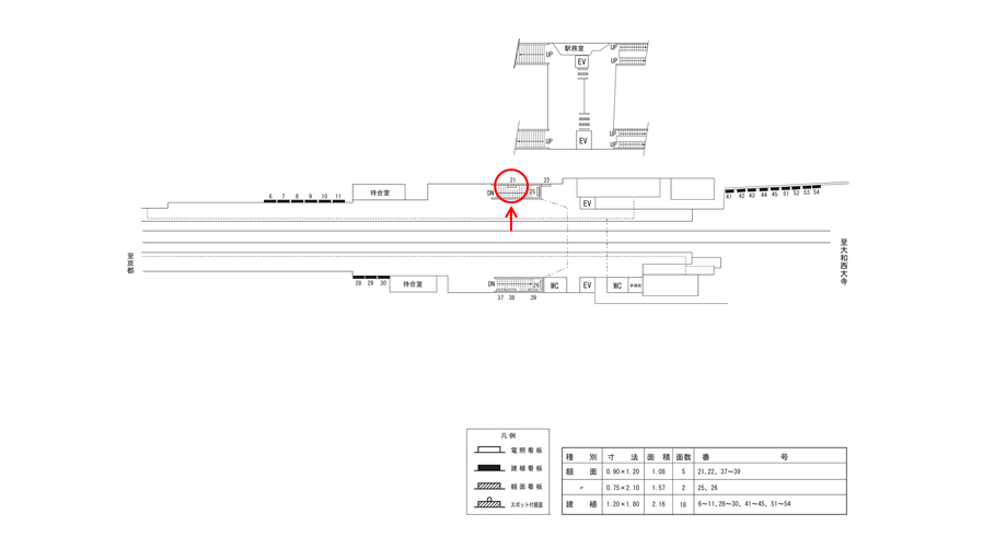 駅看板「近鉄 富野荘駅 №21」は近鉄 富野荘駅の近鉄京都線 新田辺・大和西大寺・天理・橿原神宮前方面のホーム上にある看板です。