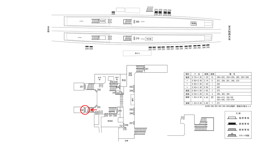 こちらの駅看板は「これから電車に乗る方」に見てもらえます。階段付近は駅利用者が集中するエリアで目に留めてもらいやすい広告ロケーションです。サービス周知や企業広告などに適しており、日常的に駅を使う「新田辺駅に生活基盤をもつ消費者」を対象とした広告にオススメです。