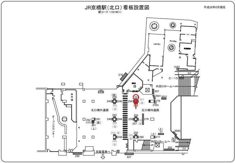 JR京橋駅の北口柵内通路の改札付近にございます電飾タイプの広告看板となります。