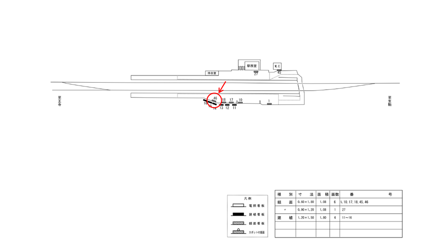 駅看板「近鉄 平群駅 №46」は近鉄 平群駅の近鉄生駒線 王寺方面のホーム上にある看板です。