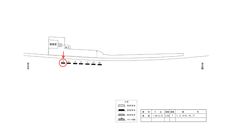 駅看板「近鉄 勢野北口駅 №6」は近鉄 勢野北口駅の近鉄生駒線の線路前にある建植看板です。改札口やトイレから近く、目立つ位置に設置されています。