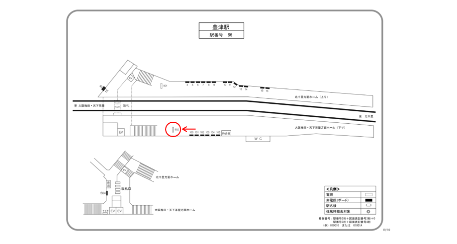 阪急 豊津駅のホーム階段付近にある駅看板です。