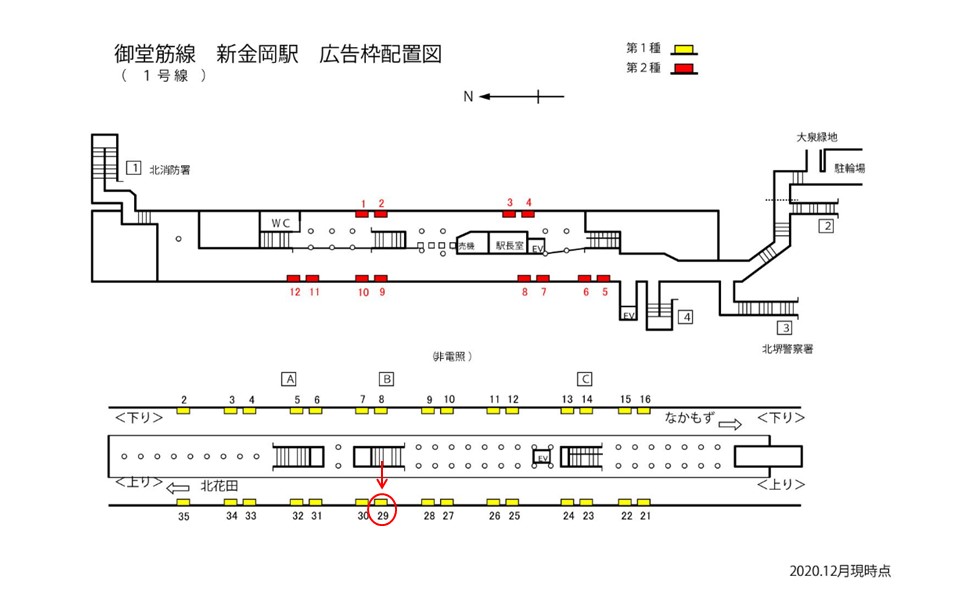 Osaka Metro御堂筋線/北行き(天王寺方面)に設置された電飾広告看板です。電車が来るまでの待ち時間を利用し、比較的長い視認時間を確保できる看板です。新金岡駅を日々利用される方へのご案内にご利用ください。